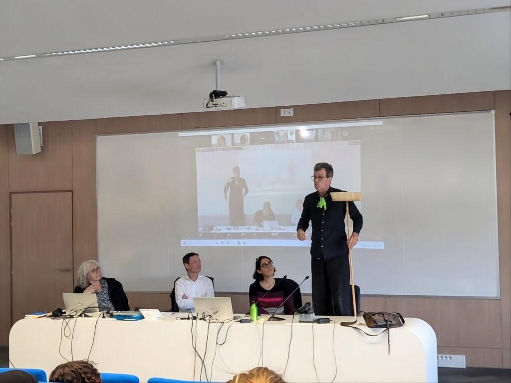 Dans l’amphi réunissant chercheurses, étudiant.e.s d’aujourd’hui et d’hier, face à l’écran de connexion en visioconférence avec l’Afrique et l’Amérique latine, le Sociologue décalé monte sur le fauteuil, montrant qu’il néglige ainsi sa respectabilité pour rapprocher sa tête des étoiles…